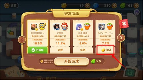 大家进入糖果赛的面板~就能看到当前的好友列表和他们使用的角色咯~点击开始游戏并在道具购买面板购买完道具以后,就能看到咱们好友助战的面板咯~点选任意好友就能提高我们在战斗中的攻击力咯~(≧▽≦)/